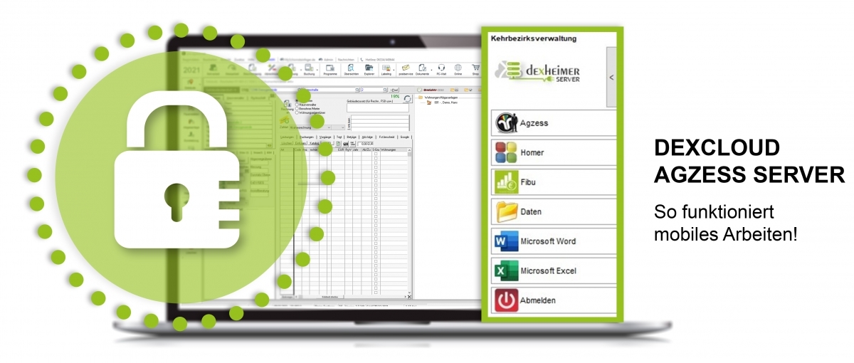 Ihre Dexheimer Softwareprogramme (AGzESS, Homer, DexFibu) installieren wir für Sie direkt auf dem Dexheimer Cloud-System und richten alles für Sie ein, so dass Sie direkt loslegen können. Sie können dann auf Ihre Anwendungen und Dateien von überall zugreifen. Ob im Büro, von zu Hause oder von jedem Ort an dem ein Internetzugang vorhanden ist.