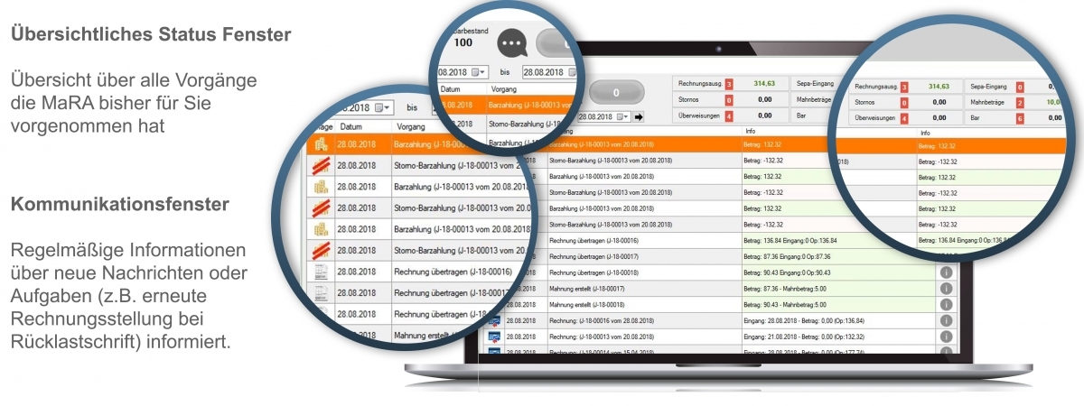 MaRA ist ein Buchungssystem zur Erfassung von Zahlungseingängen, automatisierten Zahlungserinnerungen und Mahnungen, das Controlling der Mahnfristen, sowie das Reporting aller Geschäftsvorfälle. Im Hintergrund arbeiten erfahrene Sacharbeiter die trotz Automation für Sie erreichbar sind und in Sonderfällen auch individuell, schnell und gezielt eingreifen können. Sie haben jederzeit die Möglichkeit mit den zuständigen Ansprechpartnern über ein Ticketsystem oder auch telefonisch zu kommunizieren.